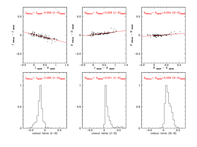 - Second, colour terms were measured for several thousand WIRCam images by comparing the instrumental WIRCam magnitudes to the 2MASS photometry. Note that even if the photometric zero-point is unknown, the colour term can still be measured. The disadvantage of this method is that the WIRCam images are much deeper than the 2MASS images. Only the faintest 2MASS stars are not saturated. Therefore their colours tend to be noisier than desirable, producing large uncertainties in the measured colour terms